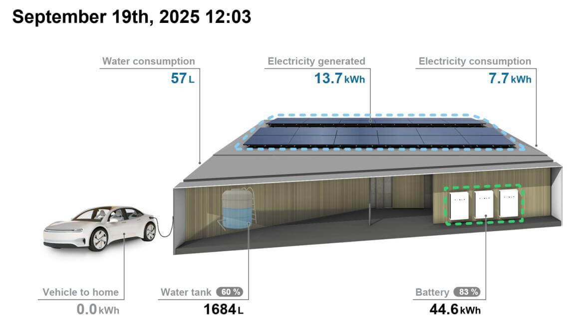 まずはオフグリッドを成り立たせるために、どれほどの電気や水が必要になるかのシミュレーションが必要となる。過去の気象庁データを解析し、オフグリッドに必要な建物スペック(太陽光パネルの面積、屋根の集水量、蓄電容量等)を計算するシステムを開発。そして設置後はどれくらいの消費電力を使用したか、蓄電池や雨水は後どの程度残っているかが確認・見える化できるオフグリッド専用の HEMS(Home Energy Management System)の開発に取り組んだ(詳細は technology の項目に詳述)