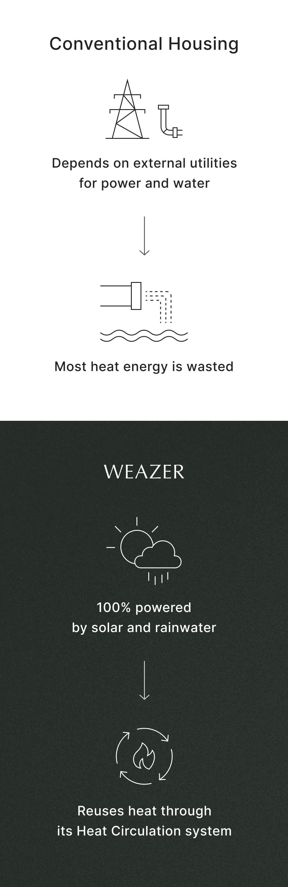The off-grid technology behind WEAZER is engineered to enable complete self-sufficiency, powered solely by natural energy sources such as sunlight and rainwater.At its core lies an advanced, proprietary energy simulation system developed by ARTH.